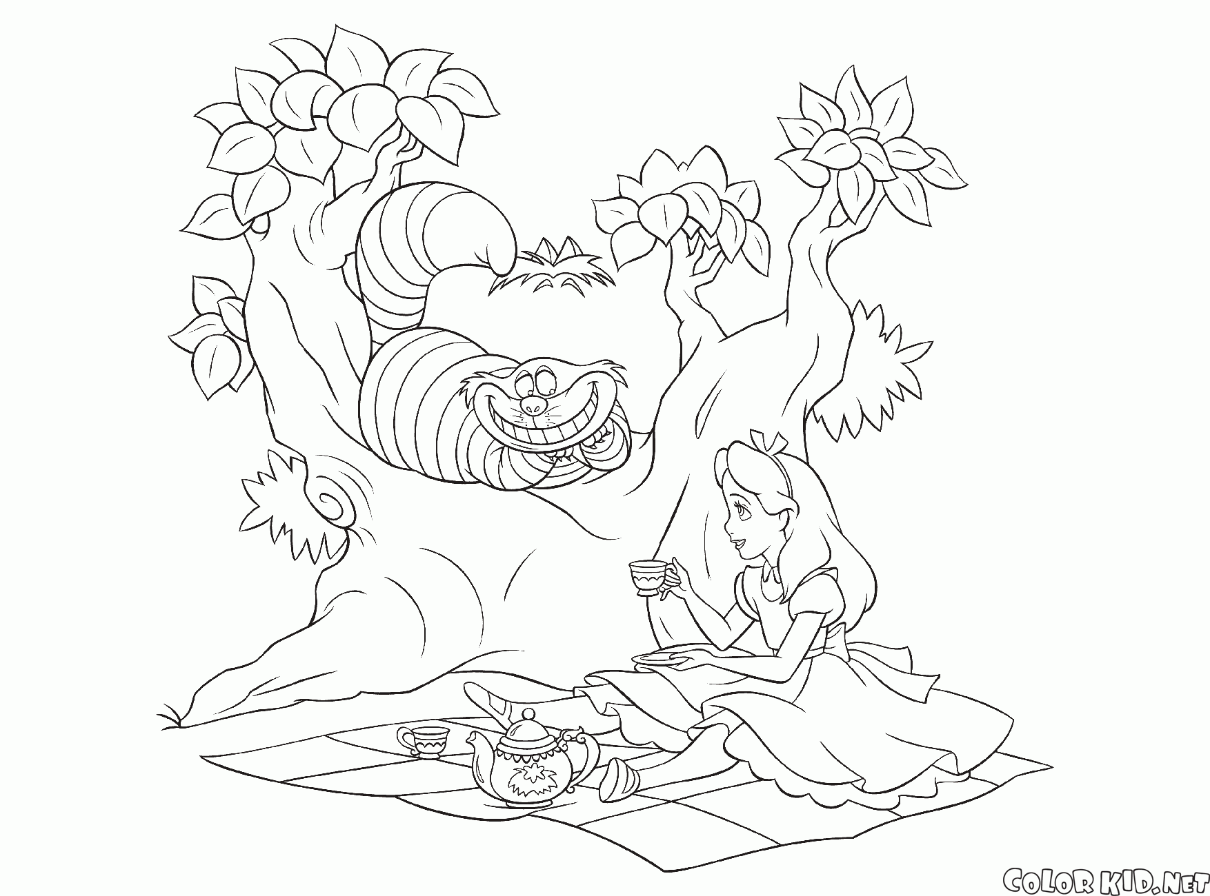 Vous pouvez télécharger et imprimer les pages à colorier pour les enfants Tea party avec le chat de Cheshire depuis notre site Web.