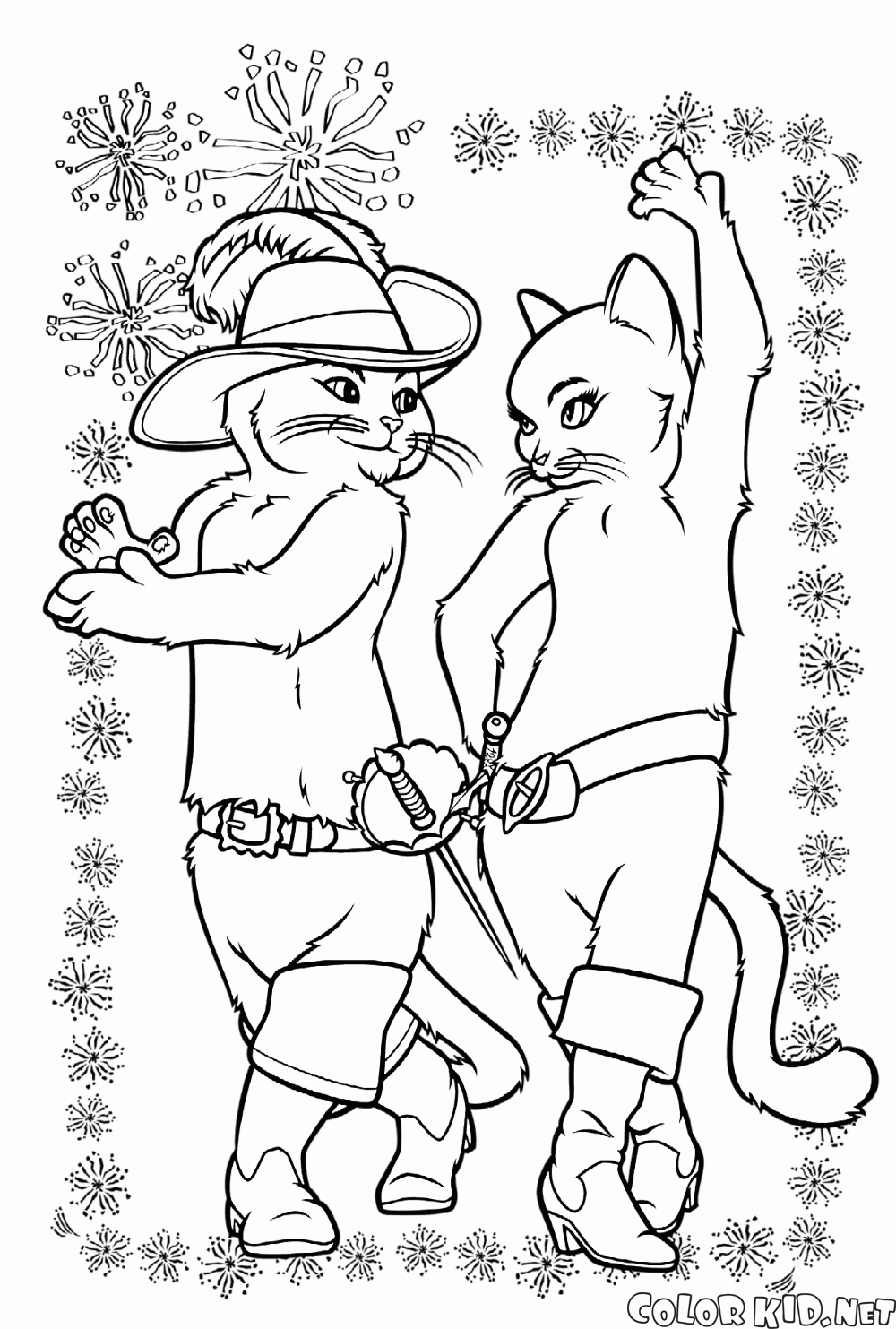Vous pouvez télécharger et imprimer les pages à colorier pour les enfants Puss in danse Bottes depuis notre site Web.