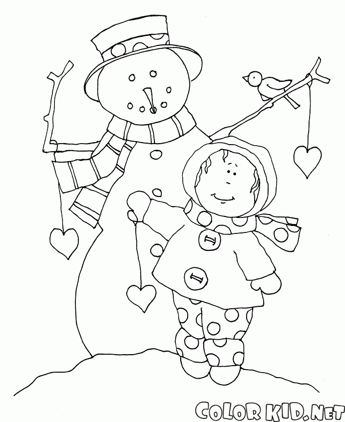 Coloriage - Bonhomme de neige et une fille