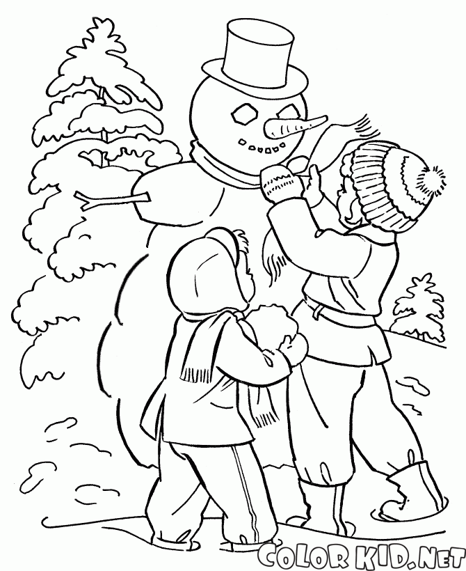 Coloriage - Les enfants font des bonhommes de neige